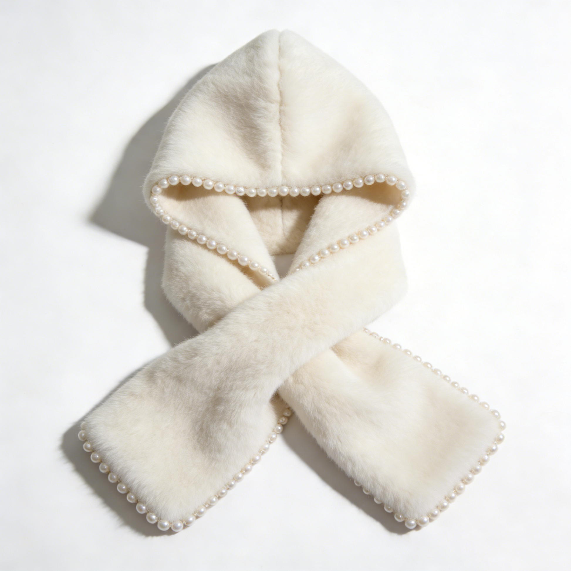 Luxurious hooded scarf in plush ivory faux fur, trimmed with elegant hand-sewn pearls. Soft, lightweight, and glamorous, ideal for elevating holiday outfits or adding a chic touch to cold-weather looks.