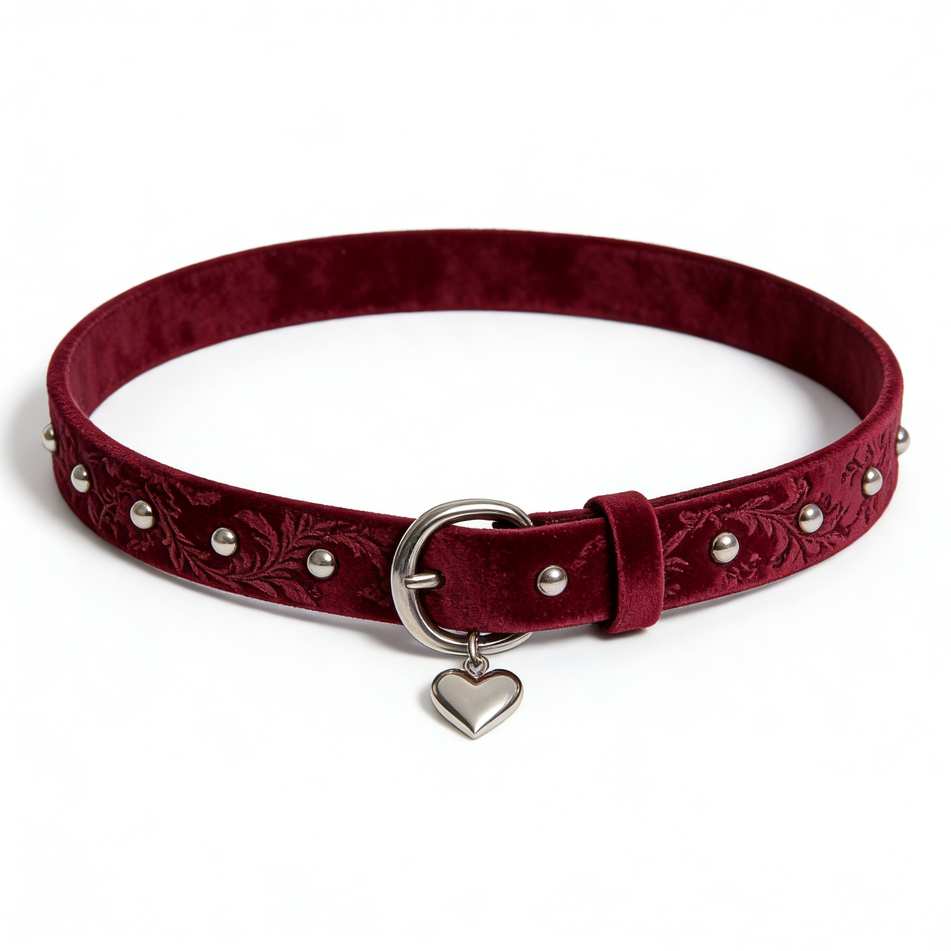 Luxurious burgundy velvet choker belt with silver studs, an O-ring, and a polished heart charm. A soft, romantic gothic piece for everyday or special occasions.