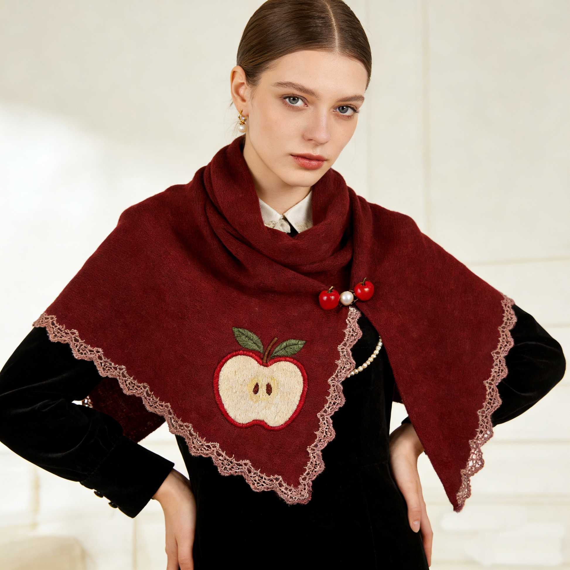 Chic burgundy wool shawl featuring a hand-embroidered apple motif and lace trim, secured with a cherry and pearl brooch. A charming, festive accessory.