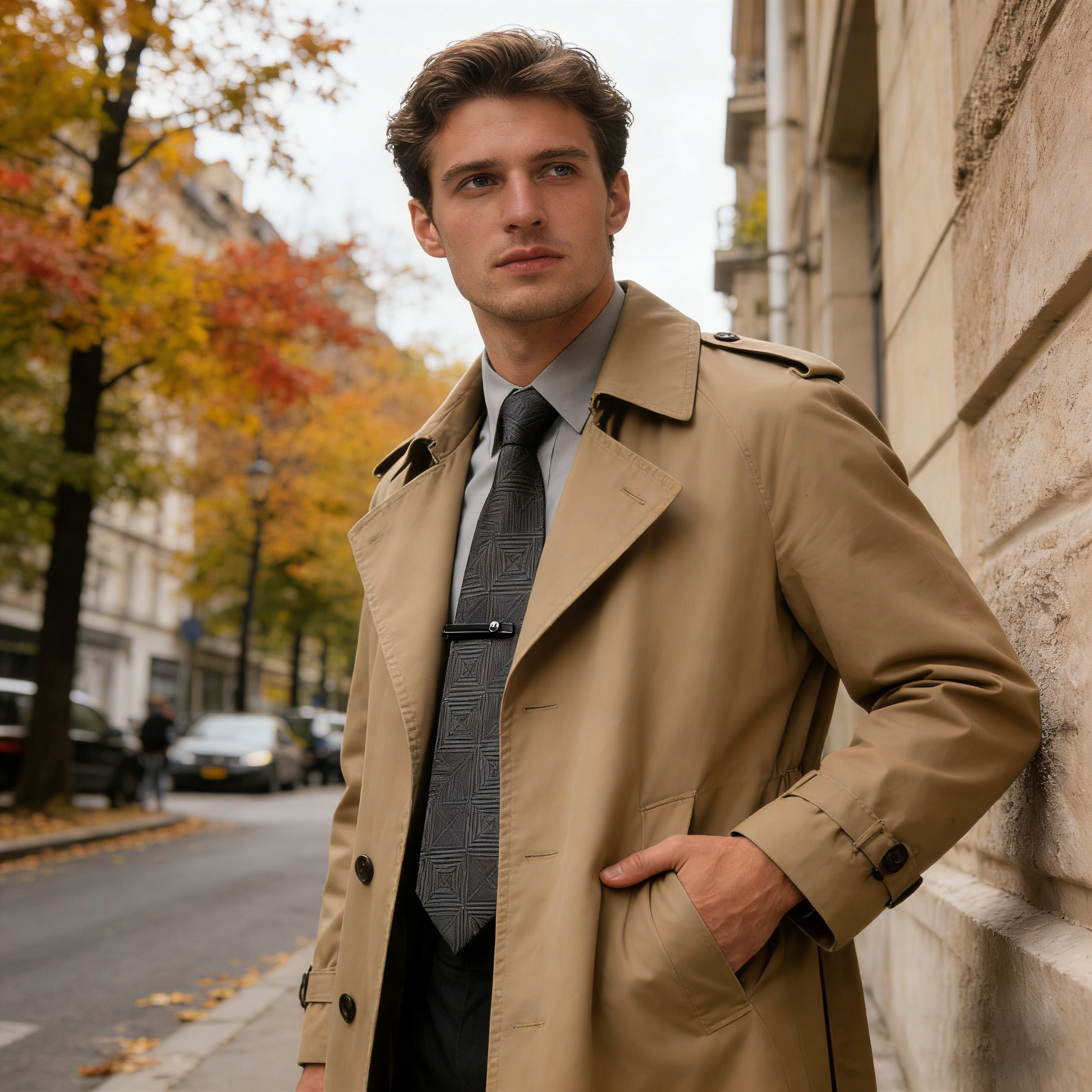 Sleek black tie with geometric patterns and a diamond accent bar. Ideal for corporate events, evening galas, or formal dinners. Adds edge to classic attire.