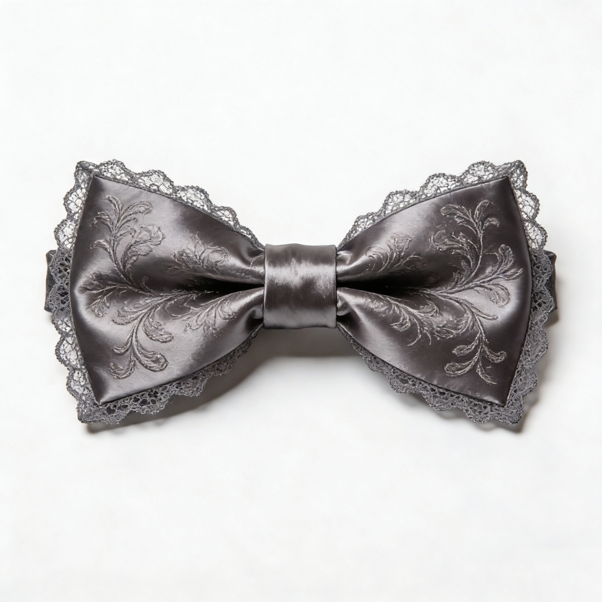Sleek gray satin bow tie with subtle floral embroidery and matching lace trim. Modern yet elegant, suitable for corporate events, graduations, or cocktail parties.