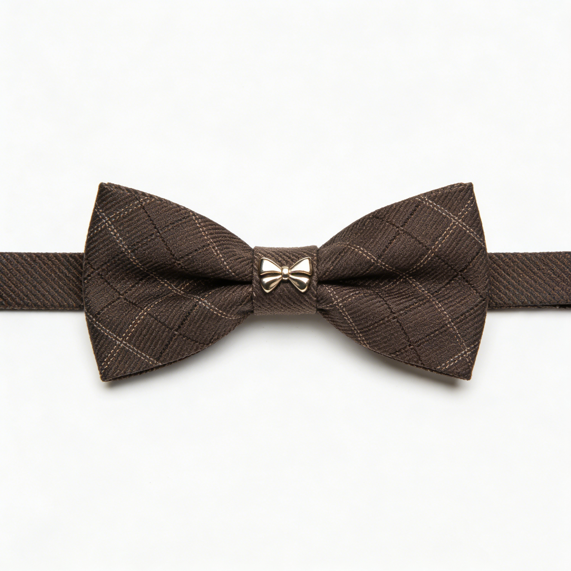 Classic brown plaid bow tie with subtle stitching and a small metallic bow accent. Versatile for business meetings, dinners, or casual formal wear. Comfortable and stylish.