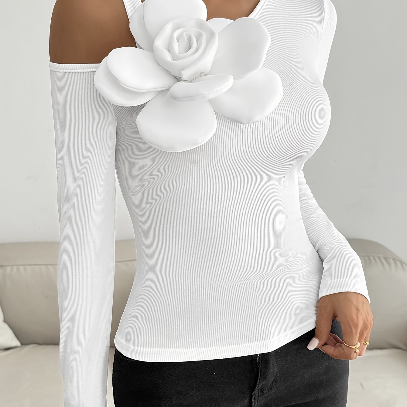 2024 Fall\u002FWinter Women's T-Shirt with 3D Rose Shoulder Cutout - Long Sleeve, Polyester, Asymmetrical Neckline, Regular Fit, Solid Color, Sleeve Length: Long Sleeve, Season: All Year Round, Details: Asymmetrical, Style: Elegant, Fabric: Stretchable, K