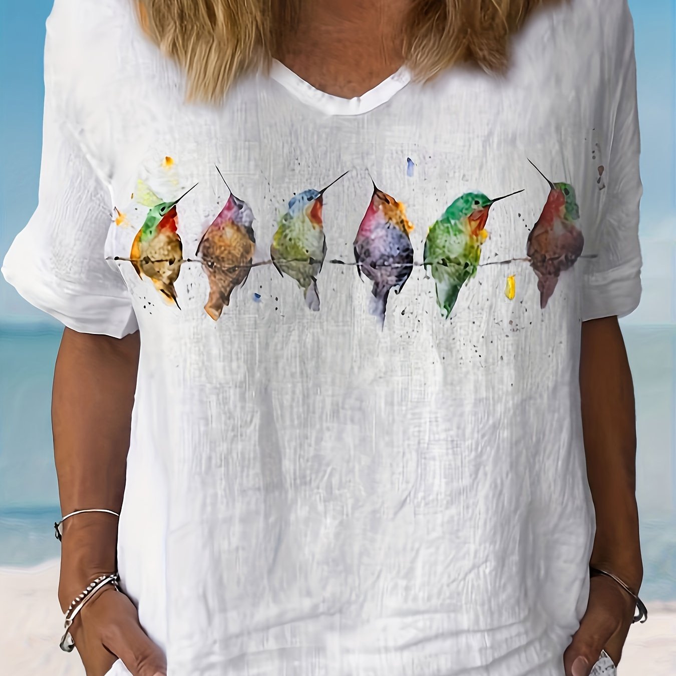 Birds Print V Neck T-shirt, Elegant Short Sleeve Top For Spring & Summer, Women's Clothing