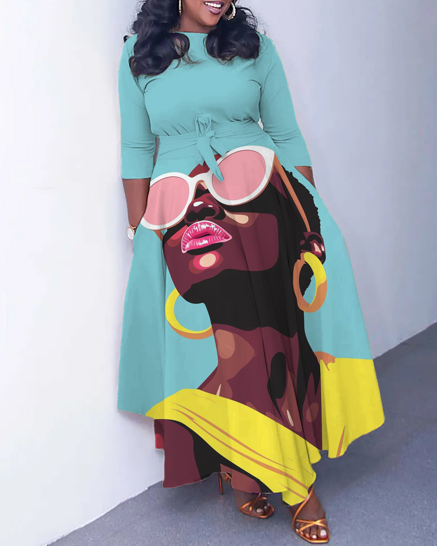 Black Woman Illustration Long Sleeve Pockets Maxi Dress