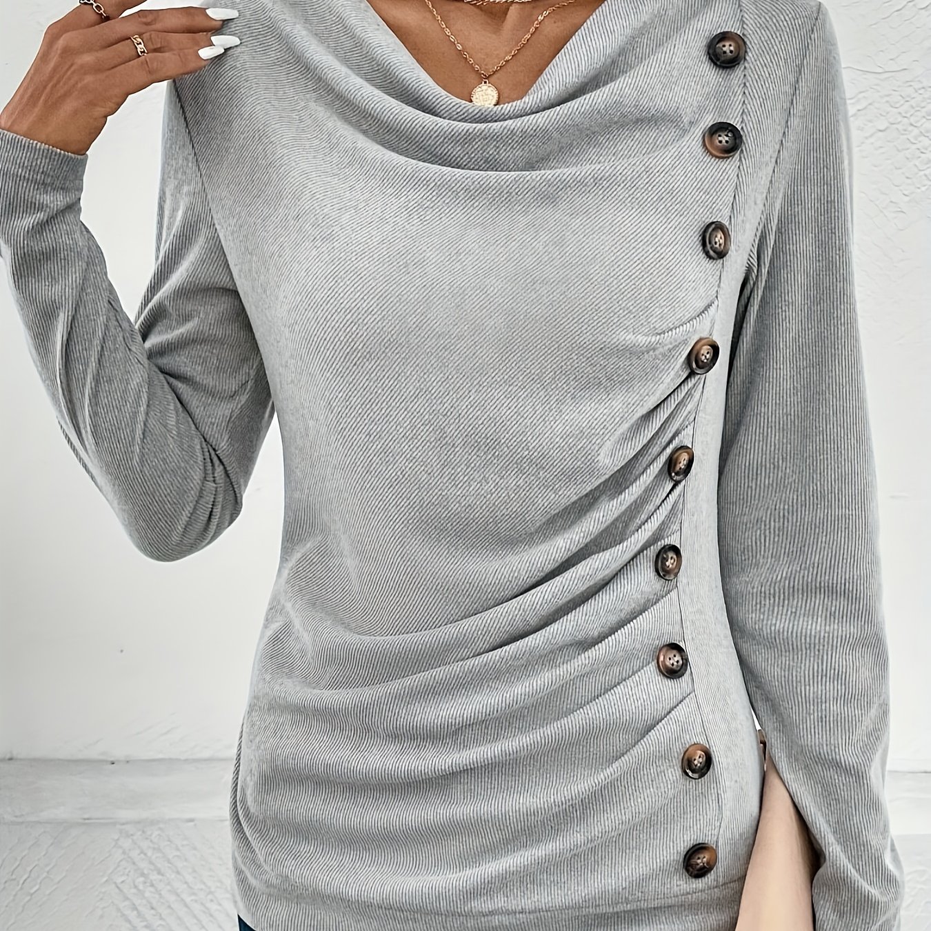 Button Side Cowl Neck T-Shirt, Casual Long Sleeve Ruched Top For Spring & Fall, Women's Clothing