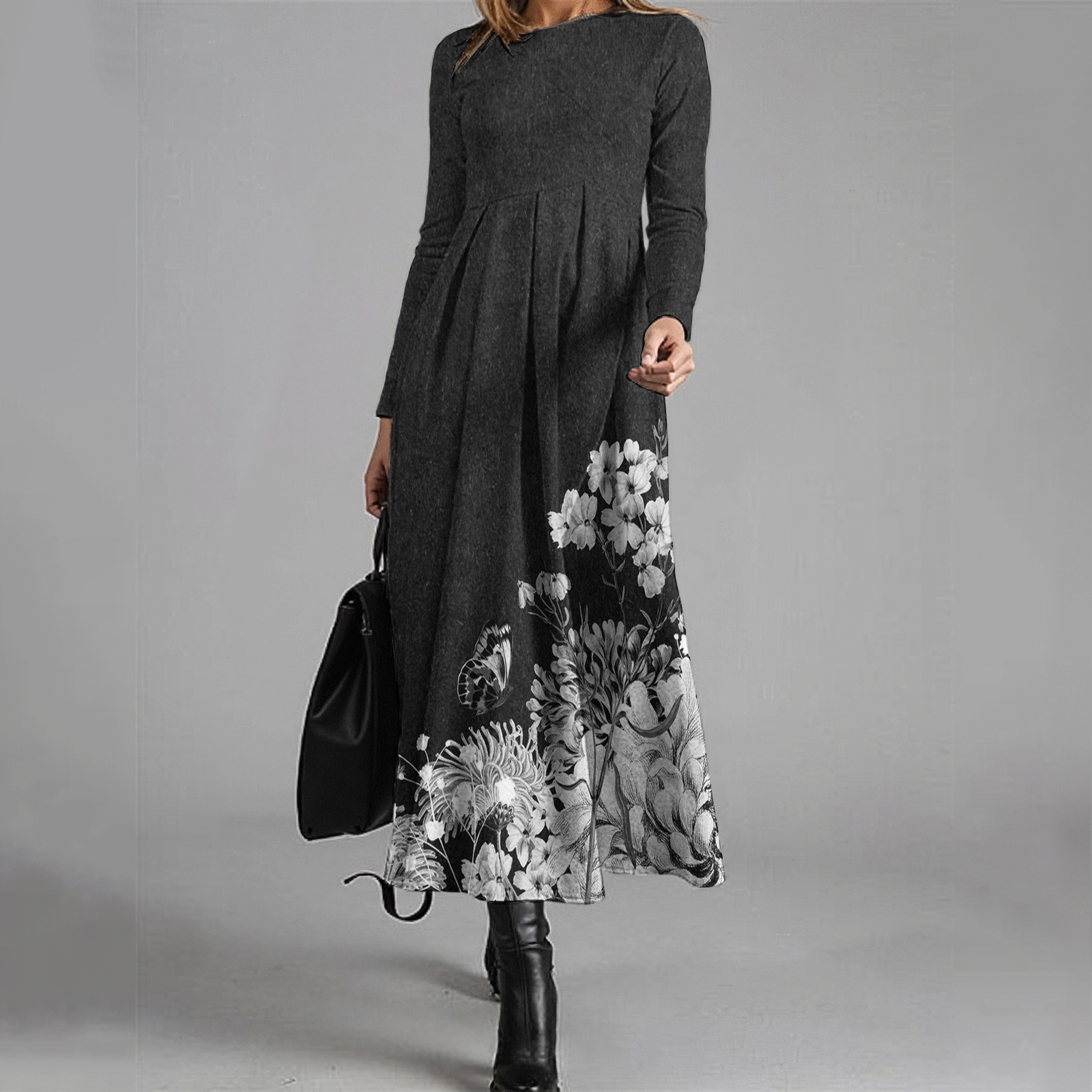 Casual Botanical Floral Gray Print Wool Midi Dress