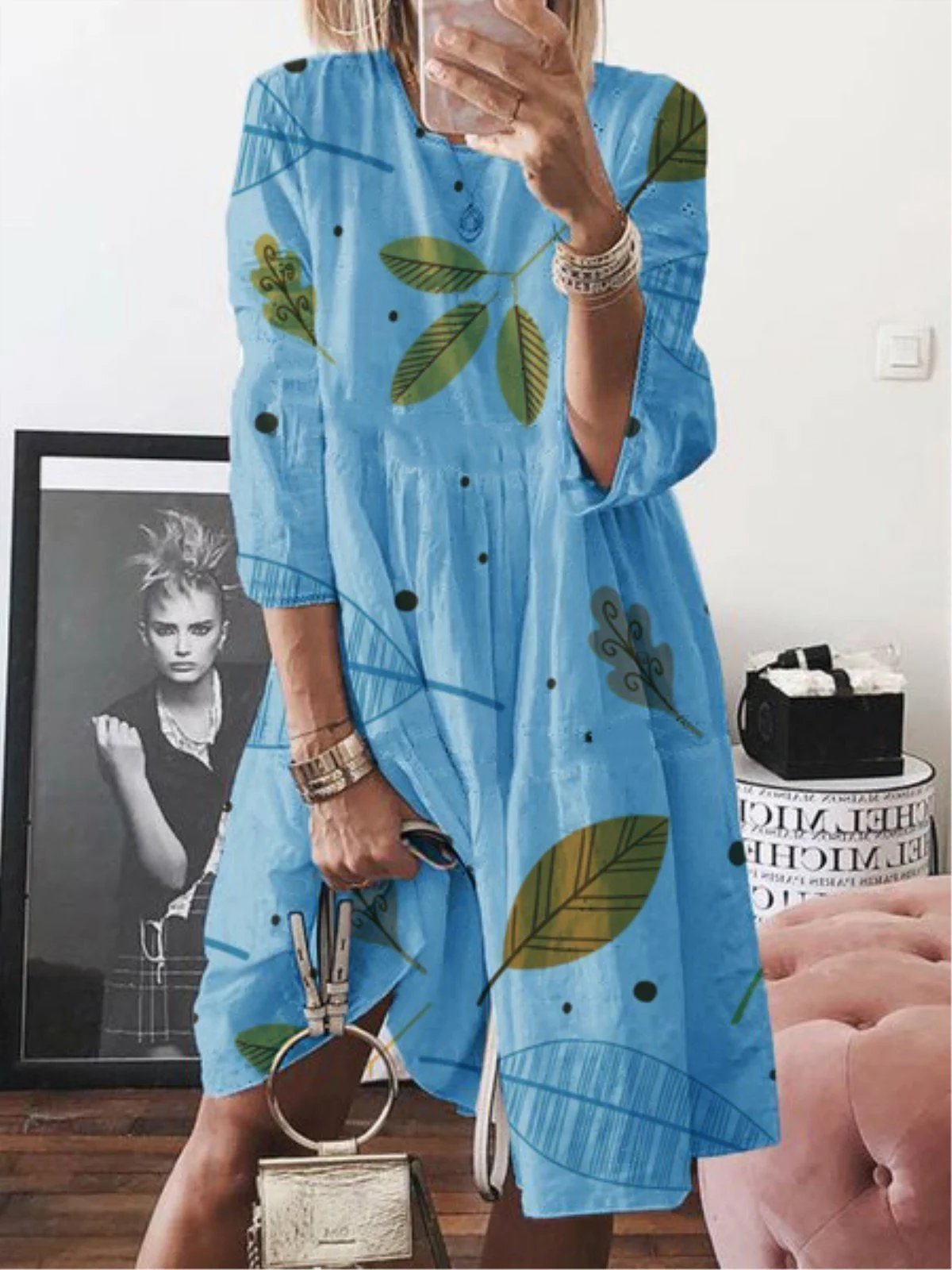 Casual Leaf Printed 3/4 Sleeve Crew Neck Dress