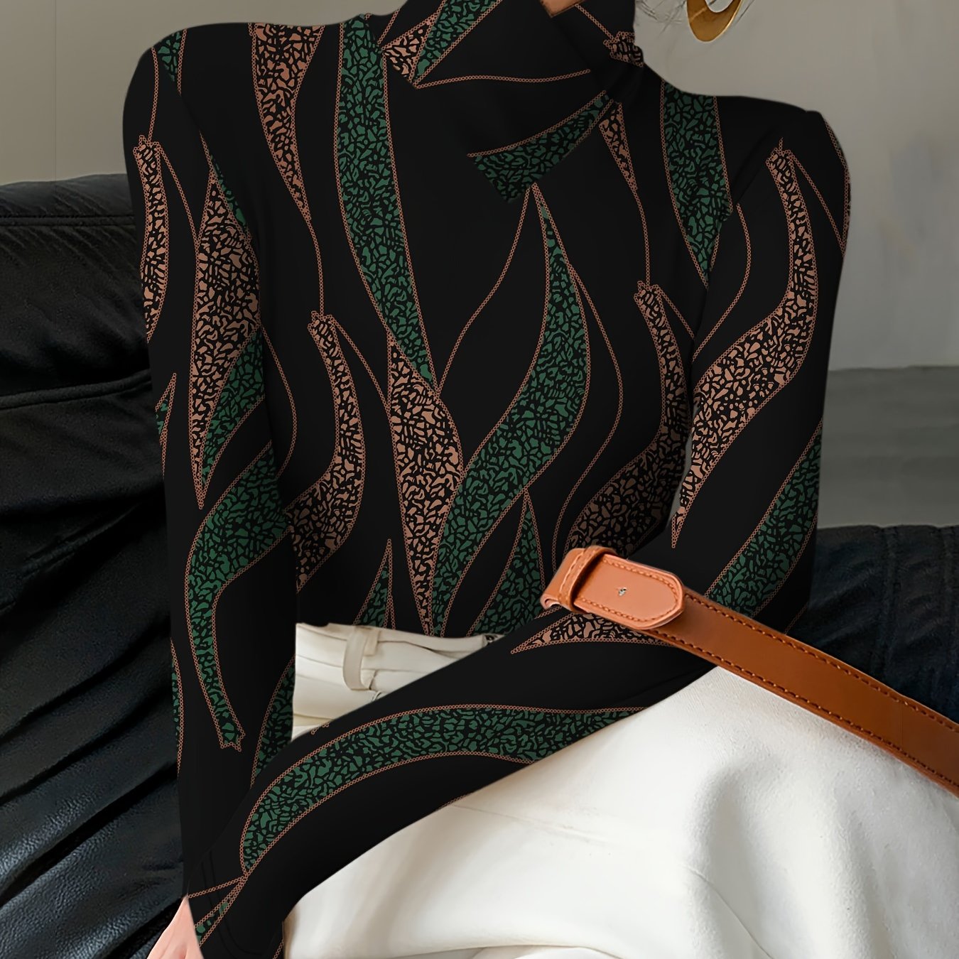 Chic Geometric Print Turtleneck Tee for Women - Long Sleeve, Stretchy Polyester, Machine Washable - Perfect for Fall\u002FWinter