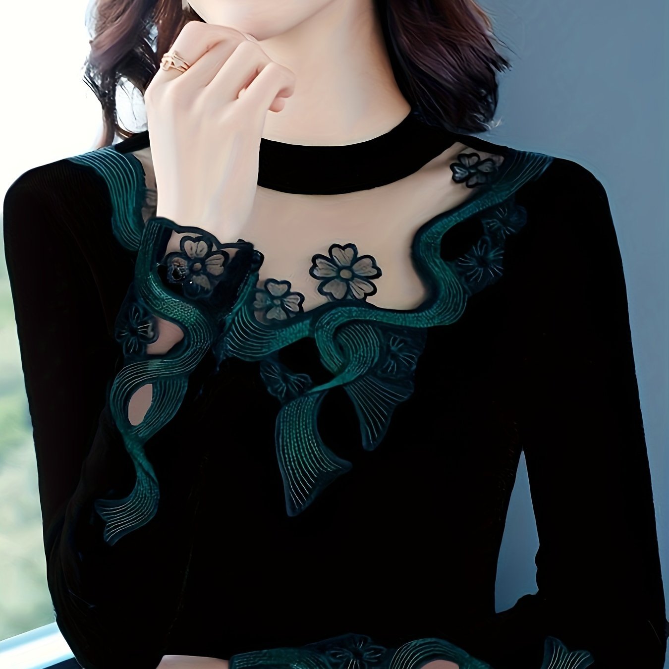 Contrast Lace Mock Neck T-Shirt, Elegant Long Sleeve Top for Spring & Fall, Women's Clothing