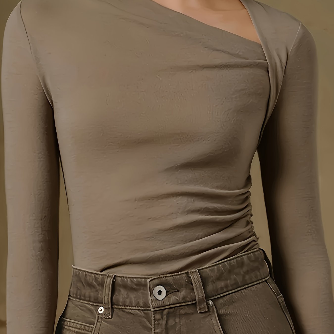 Elegant Asymmetrical Neck Long Sleeve T-Shirt for Women - Slim Fit, Solid Black, Soft Polyester Blend, Machine Washable, Versatile Layering Piece for Fall Outfits, Chic Casual Wear | Slim Fit Tee | Sophisticated Knitwear, Ladies T Shirts