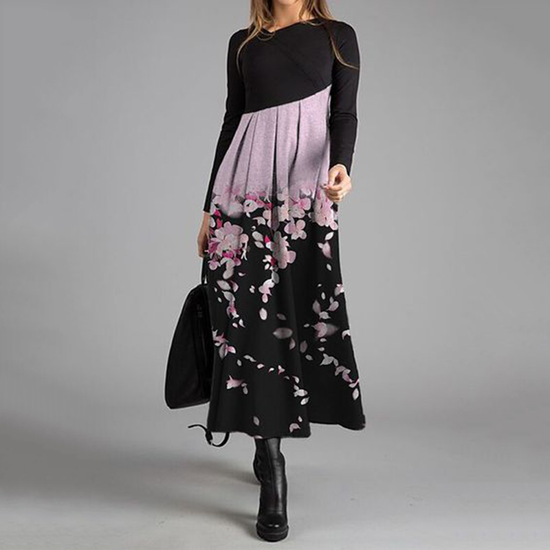 Elegant Cherry Blossom Print Crew Neck Long Sleeve Midi Dress