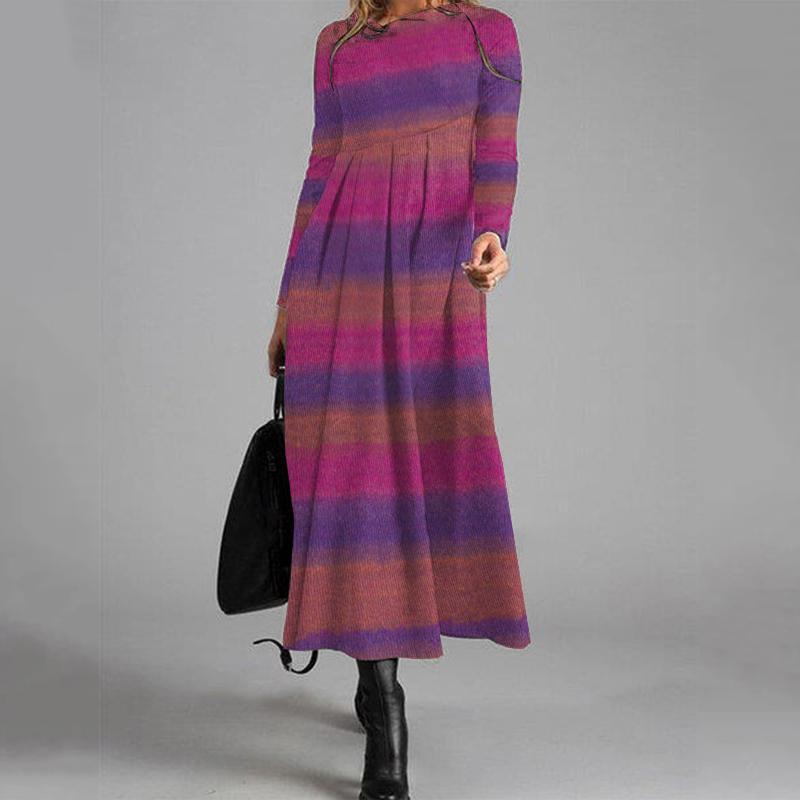 Elegant Contrast Striped Pleated Mid-Length Wool Dress