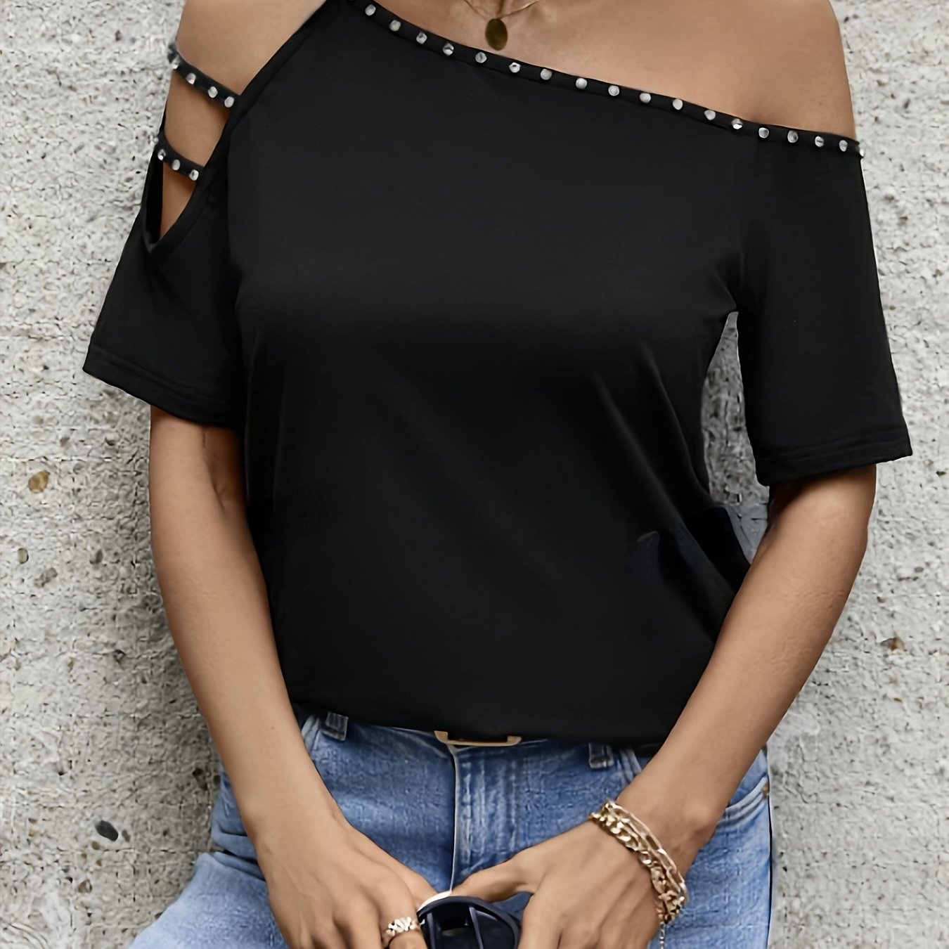 Elegant Style Women's Fashion Off-Shoulder T-Shirt, Casual Solid Color Knit Fabric Top with Rhinestone Detail, 95% Polyester 5% Elastane, All-Season Regular Length Tee, Allseason Apparel | Offshoulder Tee | Polyester Blend