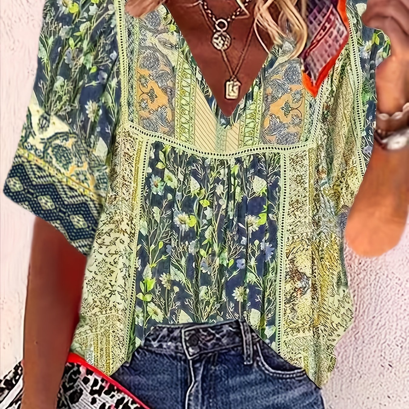 Floral Print V Neck T-Shirt, Boho Half Sleeve Top For Spring & Summer, Women's Clothing