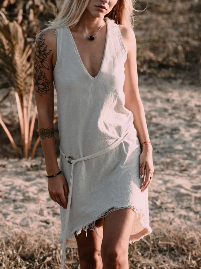 Solid color sleeveless loose cotton and linen pocket dress