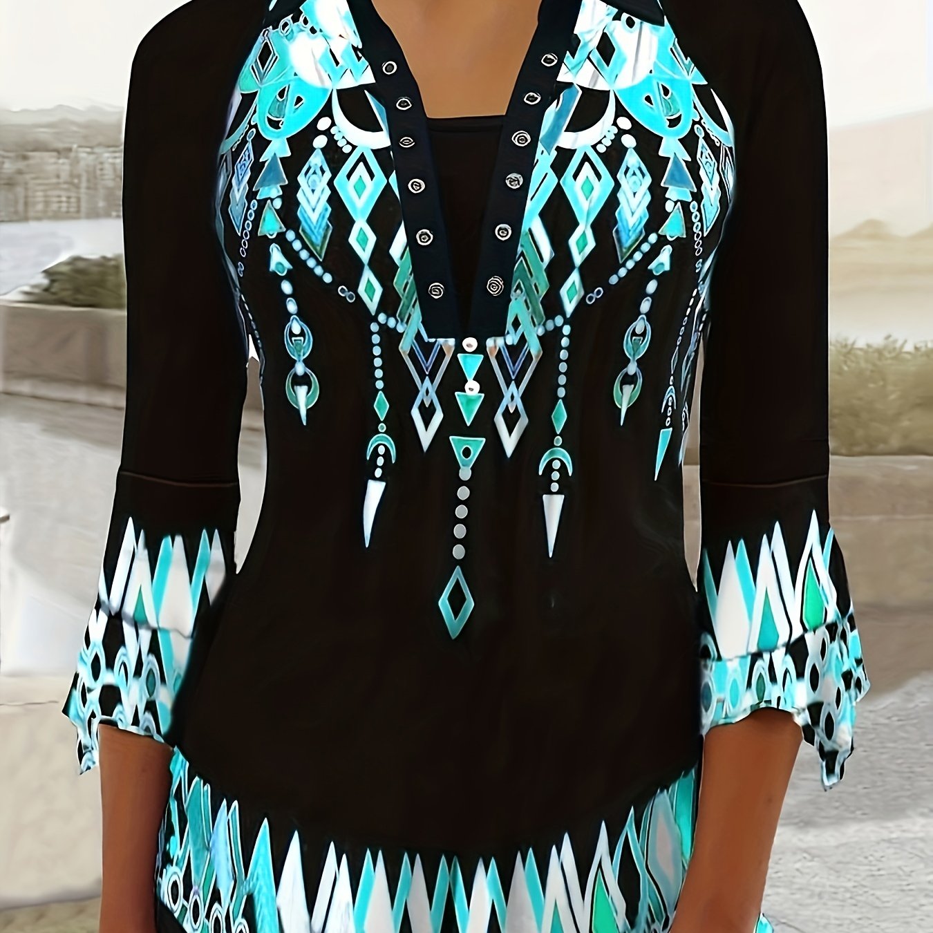 Geometric Print Collared T-Shirt - Casual Irregular Cuff Top for Women - Spring & Fall Fashion