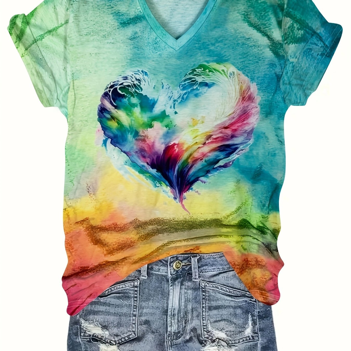 Heart Print V Neck T-Shirt, Casual Short Sleeve T-Shirt For Summer, Women's Clothing