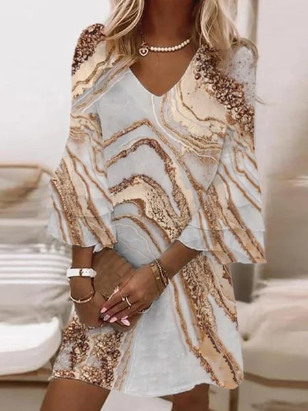 This summer-ready lightweight mini dress can be worn as a beach cover-up or as a dress for any occasion with its lightweight fit and ¾ length long sleeves and v-neckline. The rich golden marbled print and neutral shades make it perfect for pairing with gold jewelry, flats, thongs, or booties. Finish your look with a jacket for cooler nights. Wash in gentle or delicate cycle with light colors. Keep away from dark colors. The delicate fabric may absorb dark colors.