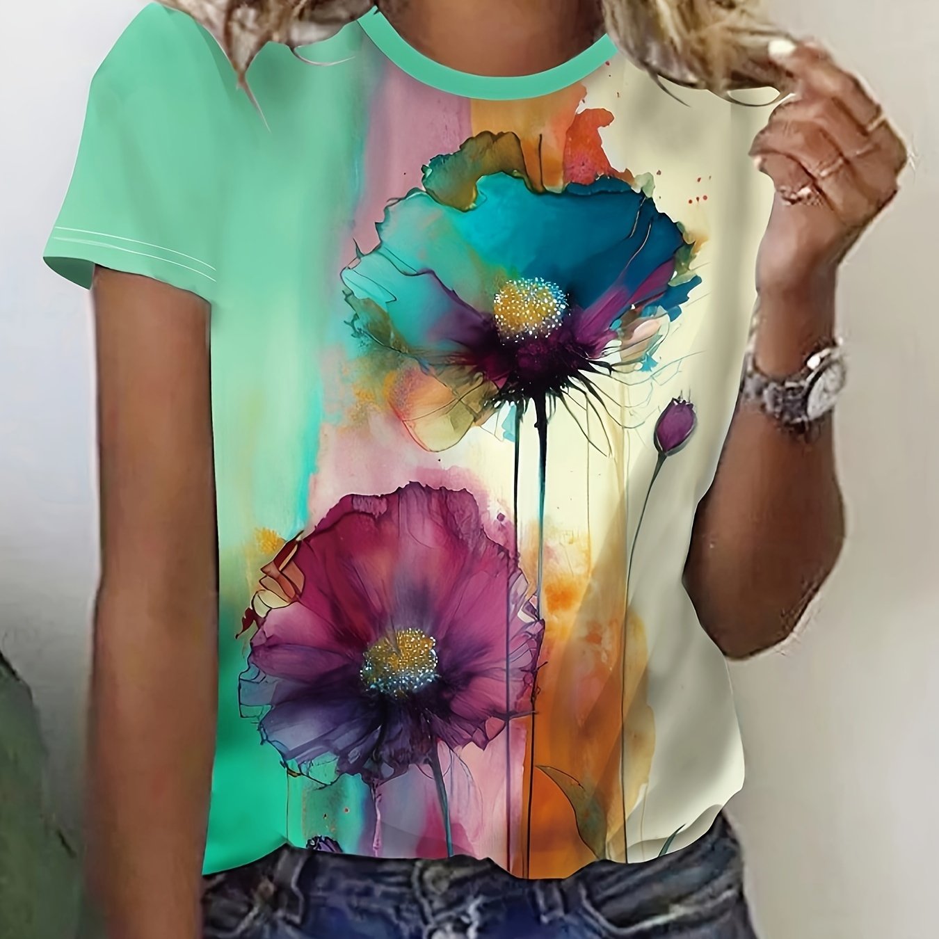 Women's Floral Print T-shirt - Casual Short Sleeve Crew Neck Top for Spring & Summer