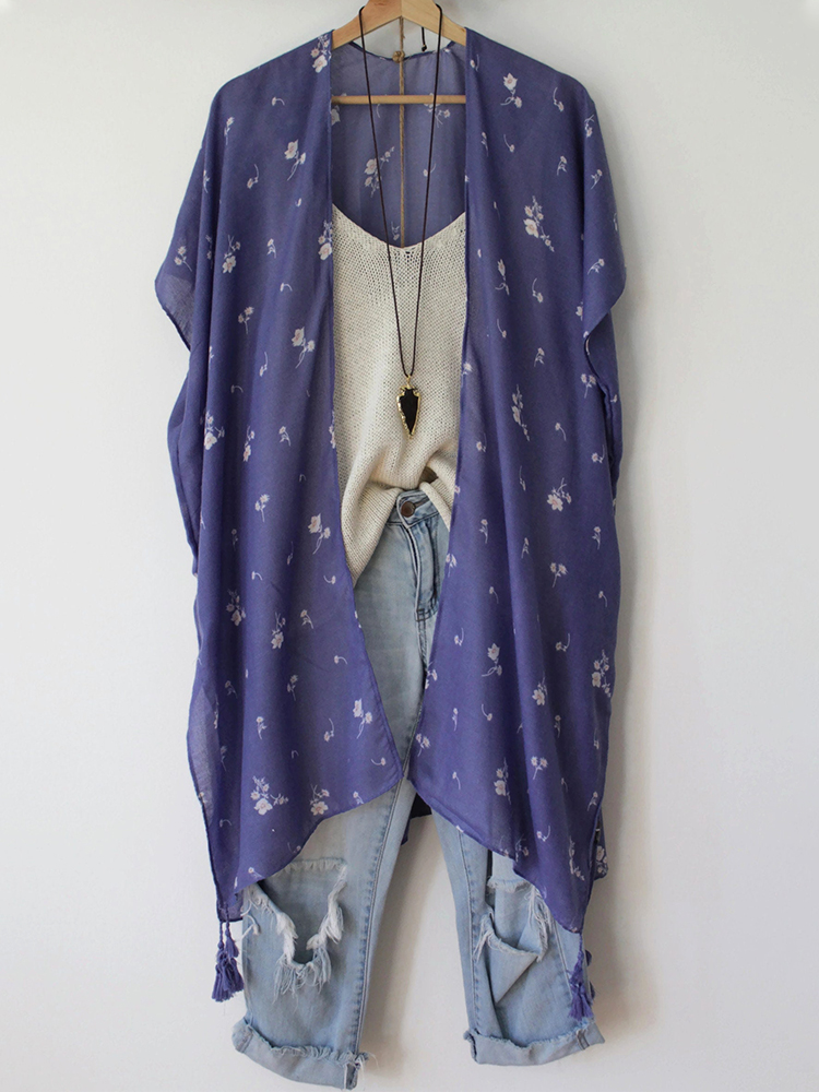 Women's Purple Floral Print Flowy Kimono Cardigan